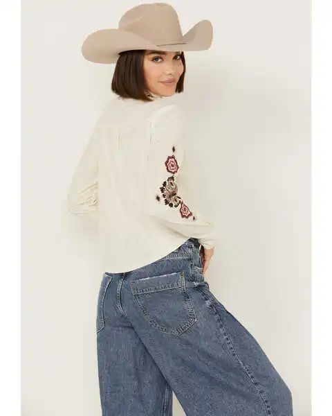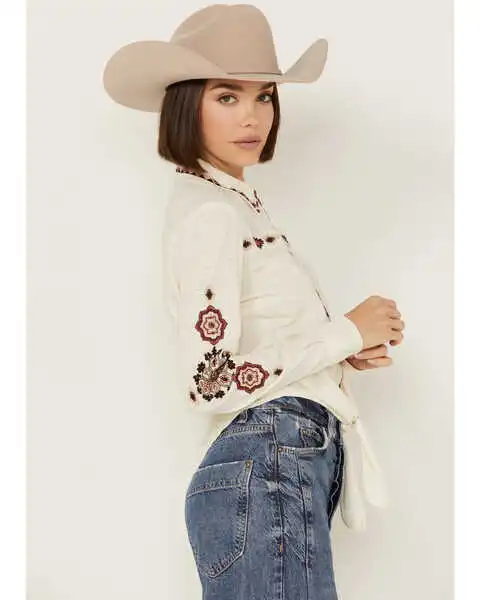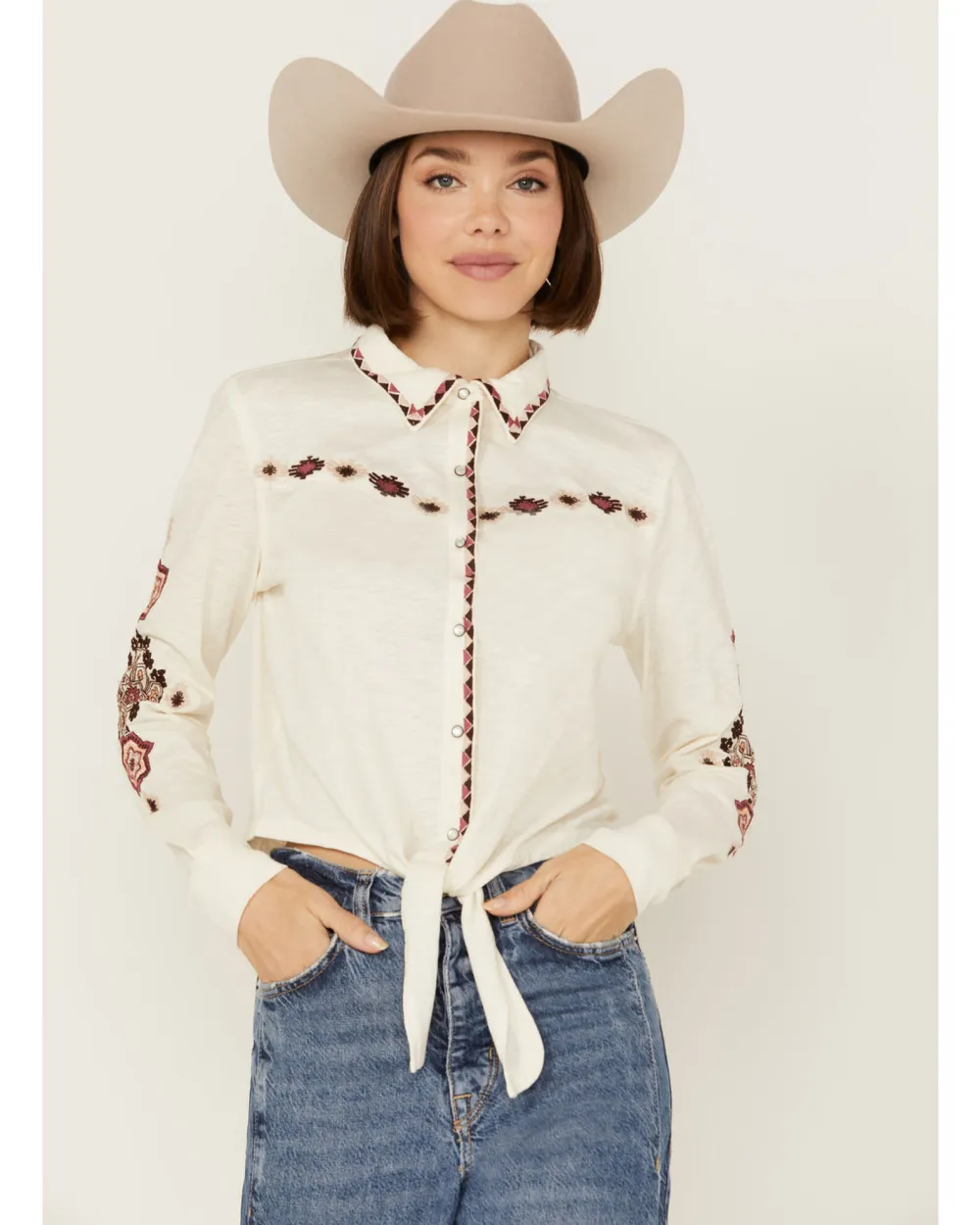 Brown, pink and cream geometric and Southwestern print embroidery on collar, placket, front yokes and sleeves